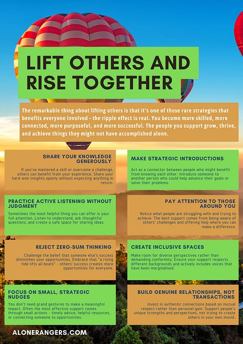The remarkable thing about lifting others is that it's one of those rare strategies that benefits everyone involved - the ripple effect is real. You become more skilled, more connected, more purposeful, and more successful. The people you support grow, thrive, and achieve things they might not have accomplished alone. The communities and organisations you're part of become more collaborative, more innovative, and more effective.